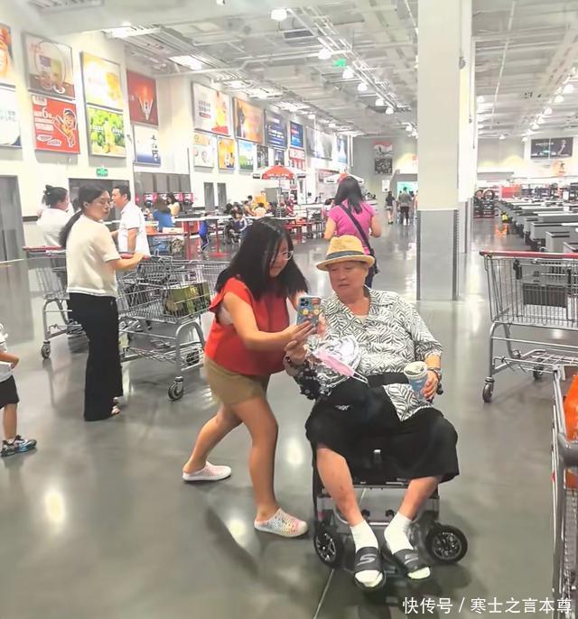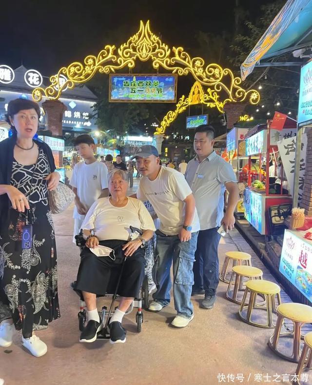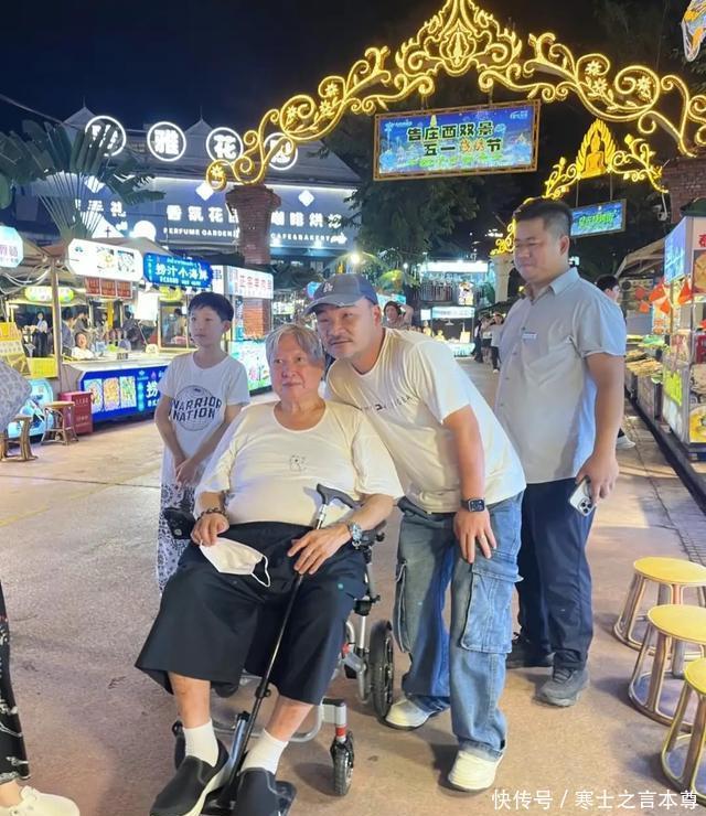 坐在轮椅上的洪金宝,头发花白、身材臃肿,看起来特别肥硕。和路人合影的时候,倒是格外慈祥,像一位白发苍苍的奶奶。 为了更加舒适一些,洪金宝还穿了一双老布鞋,其实年纪大了、在衣着上就没有太多的讲究了,主要还是以舒适为主。